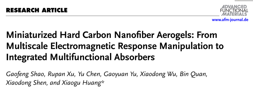 近日,化学与材料学院电磁功能材料研究团队在《Advanced Functional Materials》(影响因子18.5)发表题为“Miniaturized Hard Carbon Nanofiber Aerogels: From Multiscale Electromagnetic Response Manipulation to Integrated Multifunctional Absorbers”的研究论文,论文第一作者为邵高峰副教授,通讯作者为黄啸谷教授。
