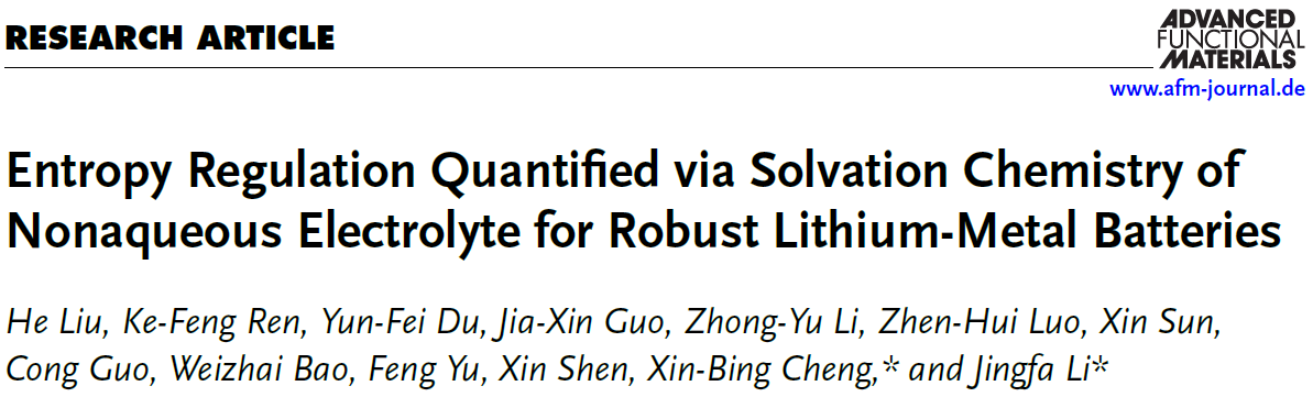 近日,化学与材料学院、新能源器件与界面科学江苏高校重点实验室微纳结构与先进能源研究团队与东南大学程新兵教授团队合作,在《Advanced Functional Materials》(SCI一区,影响因子19)发表题为“Entropy Regulation Quantified via Solvation Chemistry of Nonaqueous Electrolyte for Robust Lithium-Metal Batteries”的研究论文,论文第一作者为刘鹤副教授,通讯作者为李敬发教授和程新兵教授。