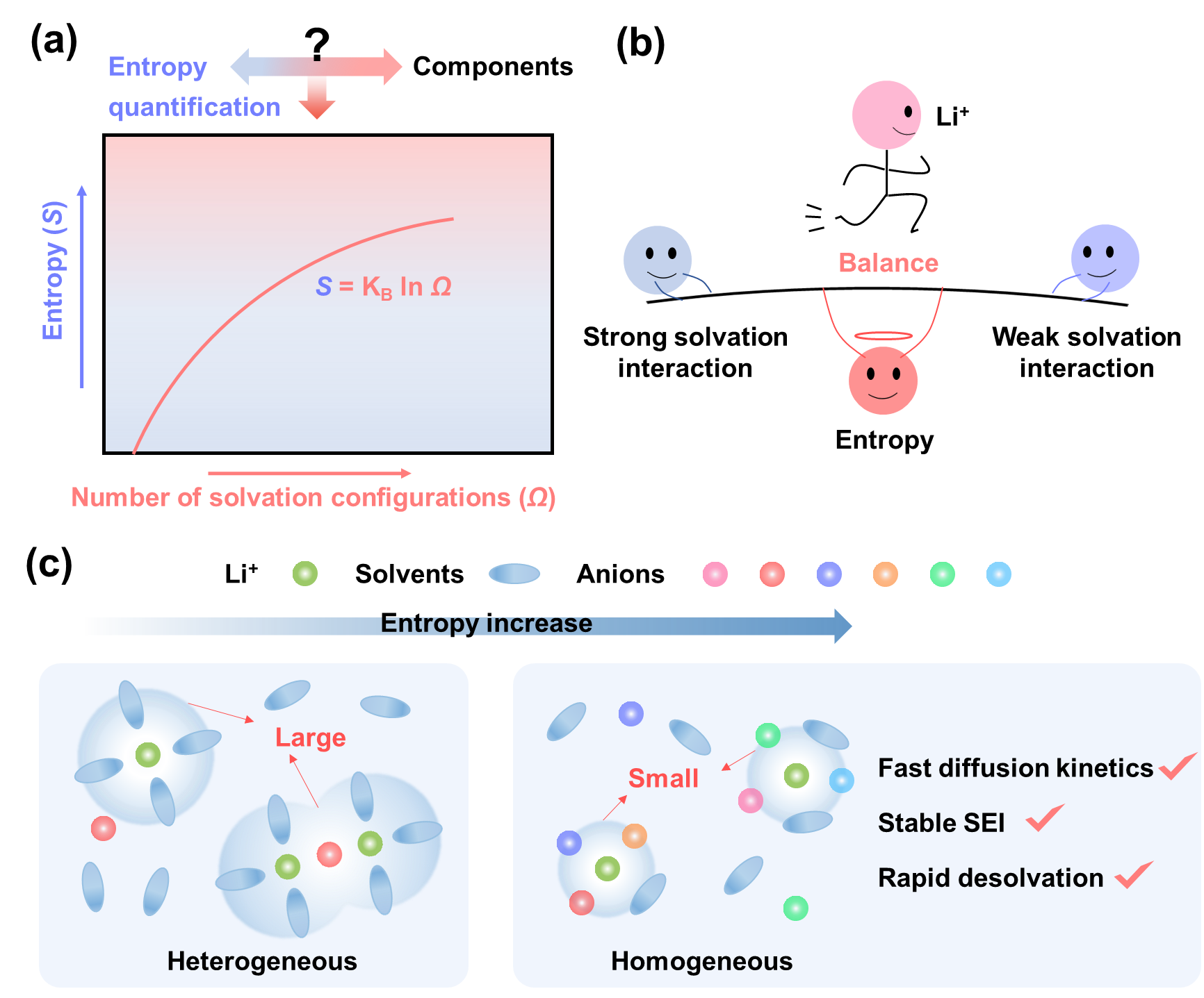 高熵的概念已应用于多种可充电电池电解质的工作中,如锂基电池、钠基电池、锌基电池、钾基电池等。然而,液态电解质体系中并非所有利用高熵的工作都必然与系统中熵的增加有关,这导致了对高熵概念的混淆和误解。目前的研究表明,更多组分的引入增加了液态电解质的熵,但高熵电解液的研究中仍然存在诸多谜团:(1)液态电解质系统的熵值定量化仍是难题,简单地用组分的数量来判断高熵或低熵缺乏严格性,亟需建立一种新的定量液态电解质熵值的方法;(2)熵与电化学性质之间的相关性尚不明确,目前的研究主要集中在高熵电解液的功能上,而这些性质可能是某些官能团相互作用的结果,应强调探索熵对电解质的直接影响,并通过熵的定量研究来探索高熵电解液的工作原理。