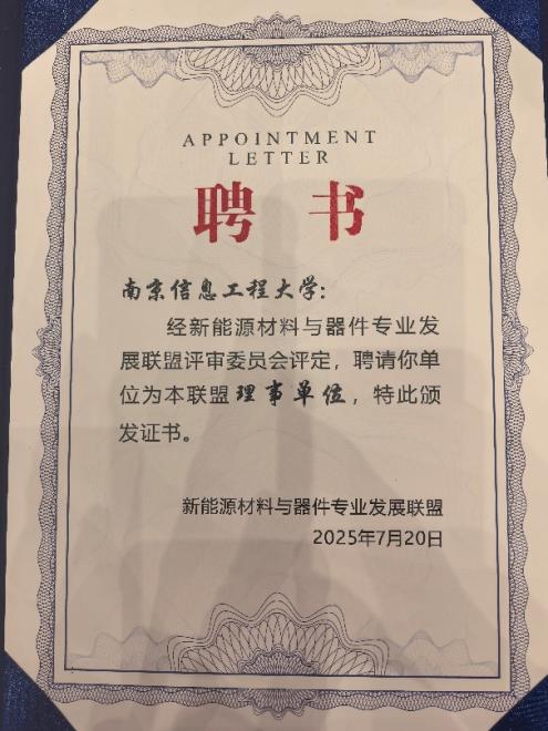 会议最后举行了“新能源材料与器件专业发展联盟”成立仪式,并为首批常务理事单位、理事单位及会员单位颁发证书。该联盟旨在联合全国高校与专业出版机构,搭建开放共享的教学与科研平台,推动新能源材料与器件专业的高质量发展。南京信息工程大学正式加入该联盟,并当选为理事单位。