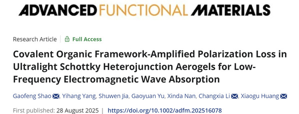 近日,化学与材料学院电磁功能材料团队在Advanced Functional Materials期刊发表题为“Covalent Organic Framework-Amplified Polarization Loss in Ultralight Schottky Heterojunction Aerogels for Low-Frequency Electromagnetic Wave Absorption”研究论文,邵高峰副教授为论文第一作者兼通讯作者,黄啸谷教授和南京工业大学李长霞教授为共同通讯作者。