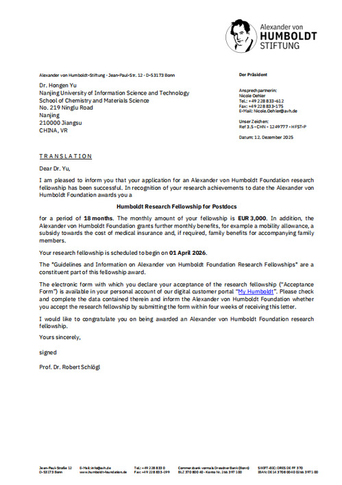 近日,德国洪堡基金会发布通知,我校化学与材料学院耿东生教授团队青年教师余洪蒽博士,入选2025年洪堡基金会博士后项目,并获得“洪堡学者”(Humboldt Research Fellowship)荣誉称号,将赴德国马克斯·普朗克化学能源转化研究所 (Max-Planck Institute for Chemical Energy Conversion)进行多相体系能源小分子电催化转化研究,合作导师为Walter Leitner教授和Alexis Bordet博士。
